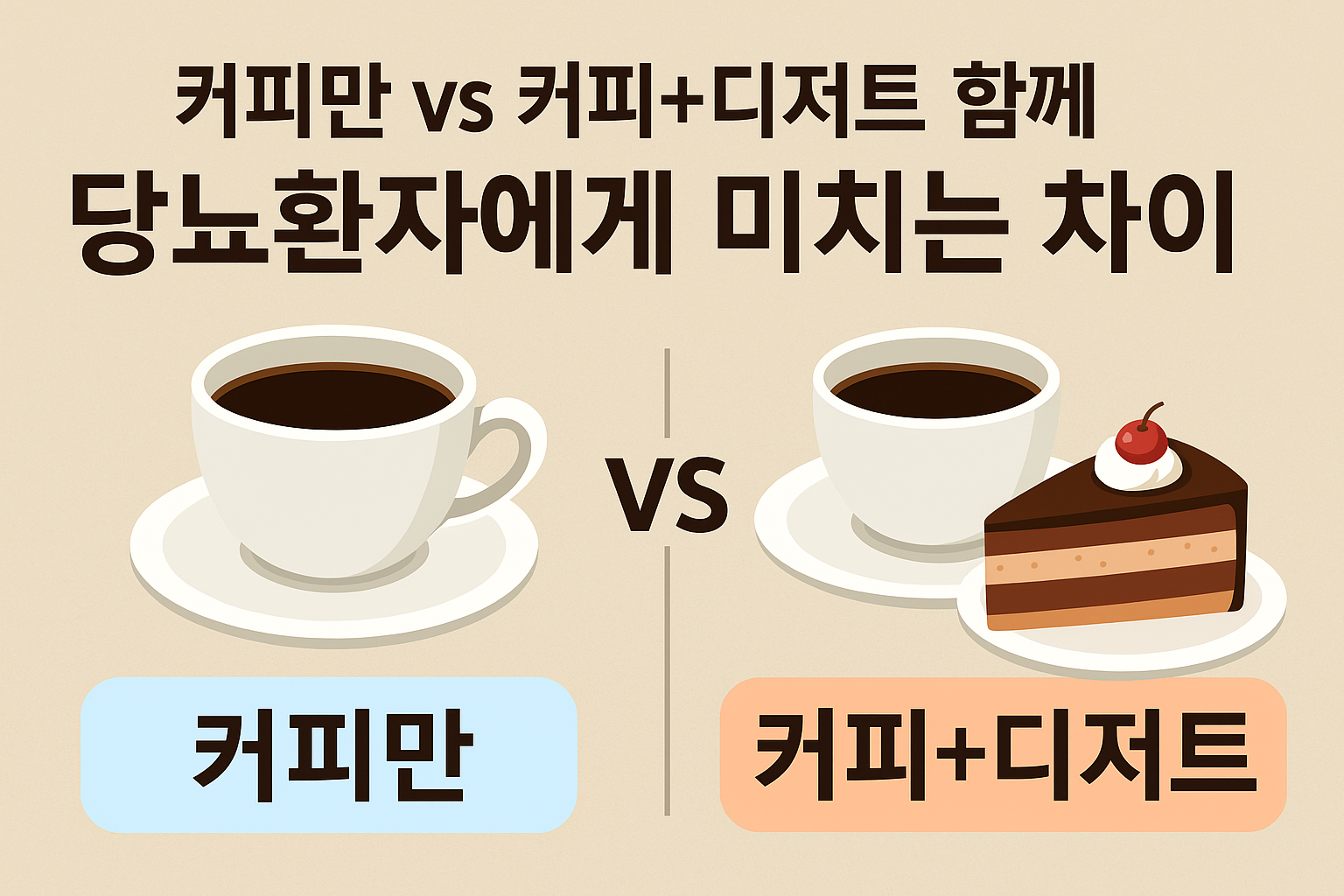 디저트는 단순당과 정제 탄수화물이 풍부하고, 커피의 카페인과 결합했을 때 혈당을 급격히 올리고 오랜 시간 유지시키는 결과를 낳습니다. 당뇨 환자에게 가장 위험한 것이 바로 이런 혈당 스파이크(급상승)와 지속적인 고혈당이므로, 커피+디저트 조합은 최대한 피하는 것이 바람직합니다.