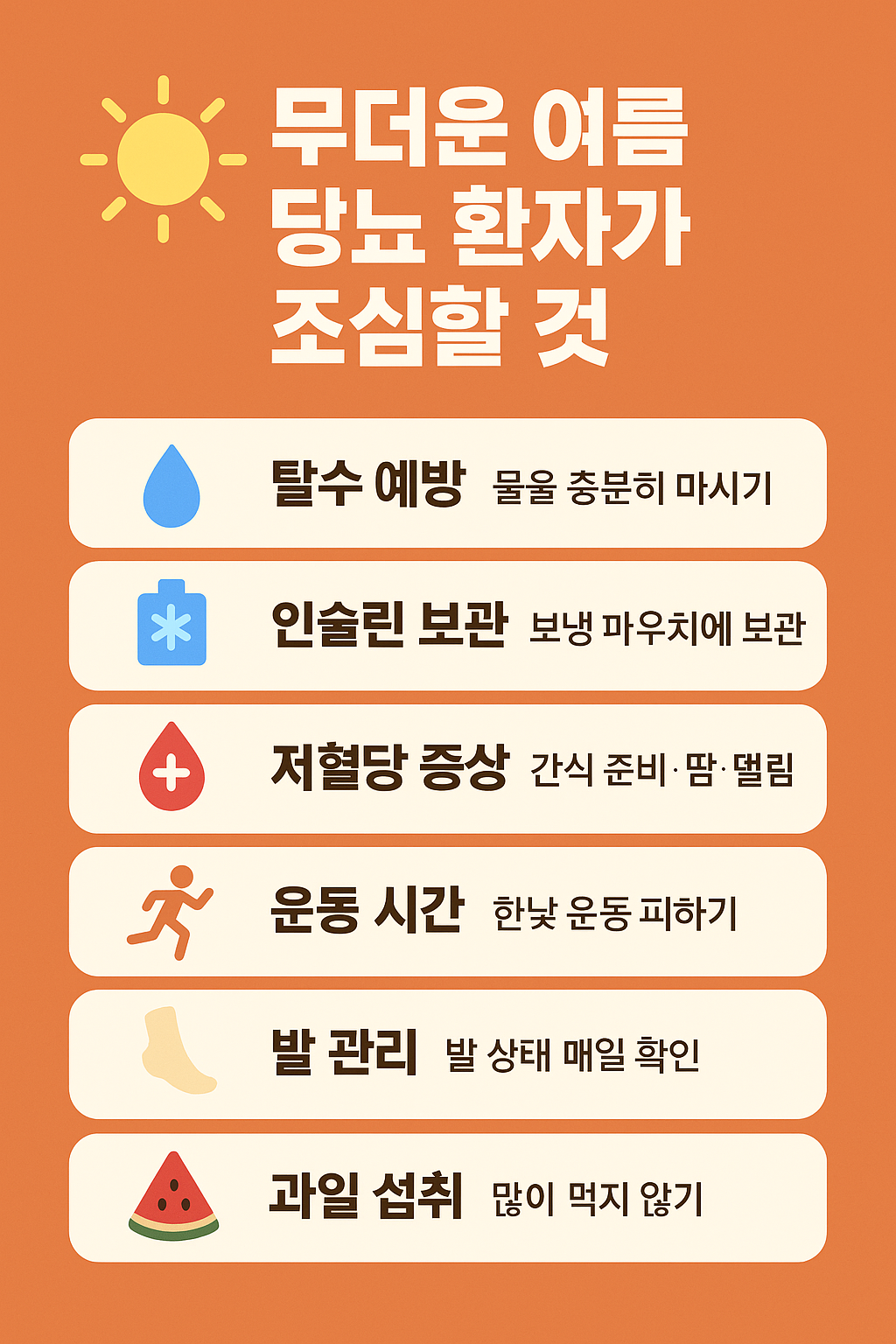 #당뇨 #당뇨병 #여름철당뇨관리 #당뇨환자주의사항 #혈당관리 #무더위건강 #인슐린보관 #당뇨발 #여름운동 #과일혈당